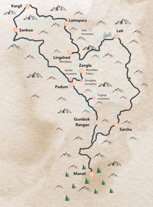 Leh – Chilling – Lingshed – Photoksar – Lamayuru – Kargil – Sankoo – Rangdum – Padum – Zangla – Phuktal – Gombo – Darcha – Manali –Sarchu – Leh