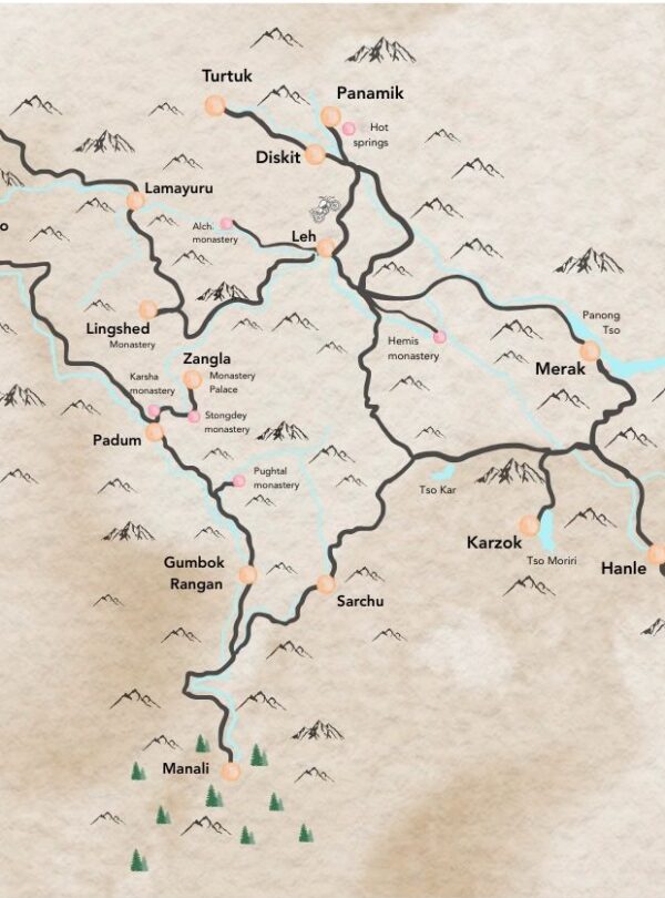 Leh – Khardung La – Diskit – Hunder (Nubra Valley) – Turtuk – Panamic – Wari La – Leh – Chang La – Durbuk – Pangong Tso – Kaksang La – Hanle – Umling La – Tso Moriri – Puga Valley – Tso kar – Tanglang La – Leh – Chilling – Lingshed – Photoksar – Lamayuru – Kargil – Sankoo – Rangdum – Padum – Zangla – Phuktal – Gombo – Darcha – Manali –Sarchu – Leh